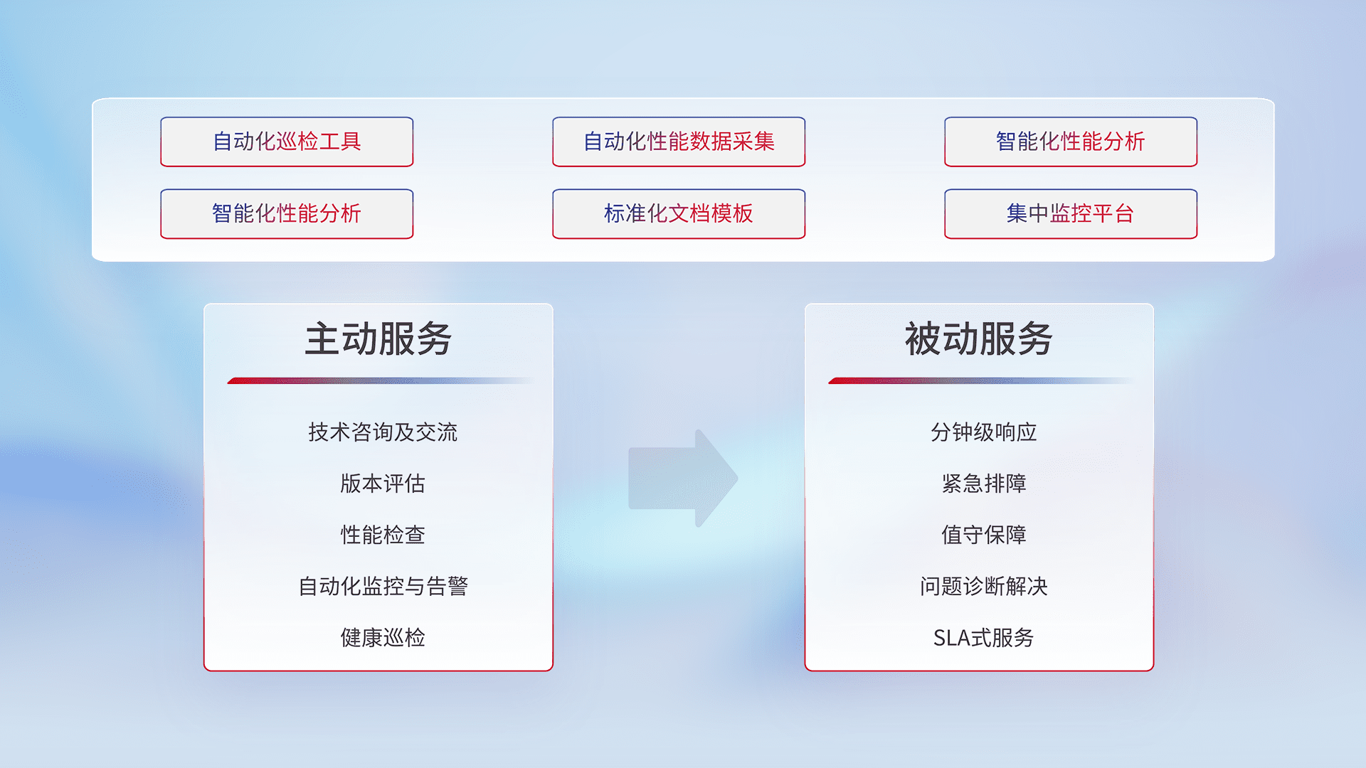 智能化工具和标准化文档,,保障服务质量,,提供主动服务(包含技术咨询、、、版本评估、、、性能检查、、、、自动化监控与告警、、、、健康巡检)和被动服务包含(分钟级响应、、、紧急排障、、、值守保障、、问题诊断解决、、SLA服务)。。。。