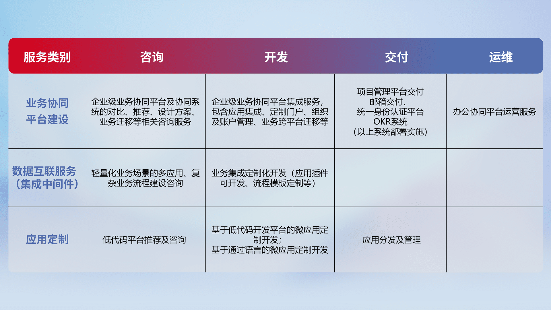 针对钉钉、、、企微、、、、IDaas等平台级产品提供产品的规划、、、方案、、、交付、、、、定制化开发等服务,,实现如统一协同办公、、、、智能客户服务、、混合会议管理、、智能数据查询、、、等业务场景,,,,实现数字化转型。。。。